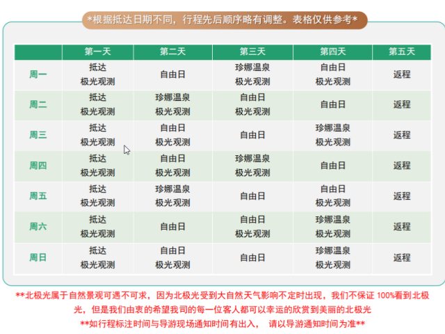 4)导游会根据日照时间调整出发时间,出发时间以当地导游通知为准。