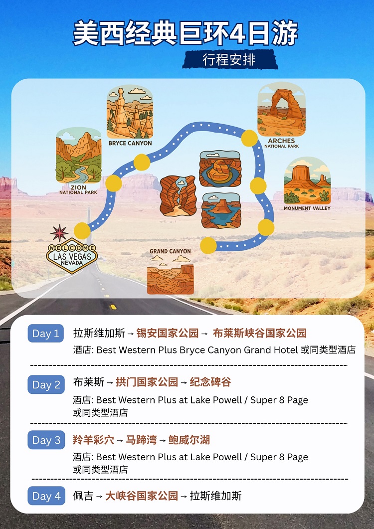 | 第1天 | 拉斯维加斯 → 锡安国家公园 → 布莱斯峡谷国家公园 | 拉斯维加斯锡安国家公园布莱斯峡谷国家公园 | |