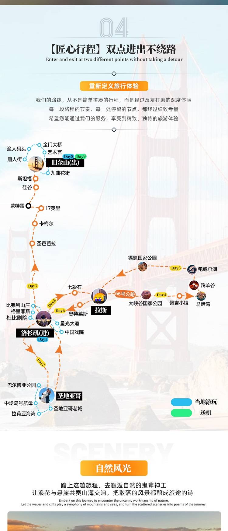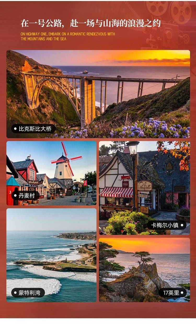 | 第7天 | 圣芭芭拉-丹麦村-17英里-卡梅尔-蒙特雷 | 圣塔芭芭拉丹麦村卡梅尔小镇十七哩大道 | |
