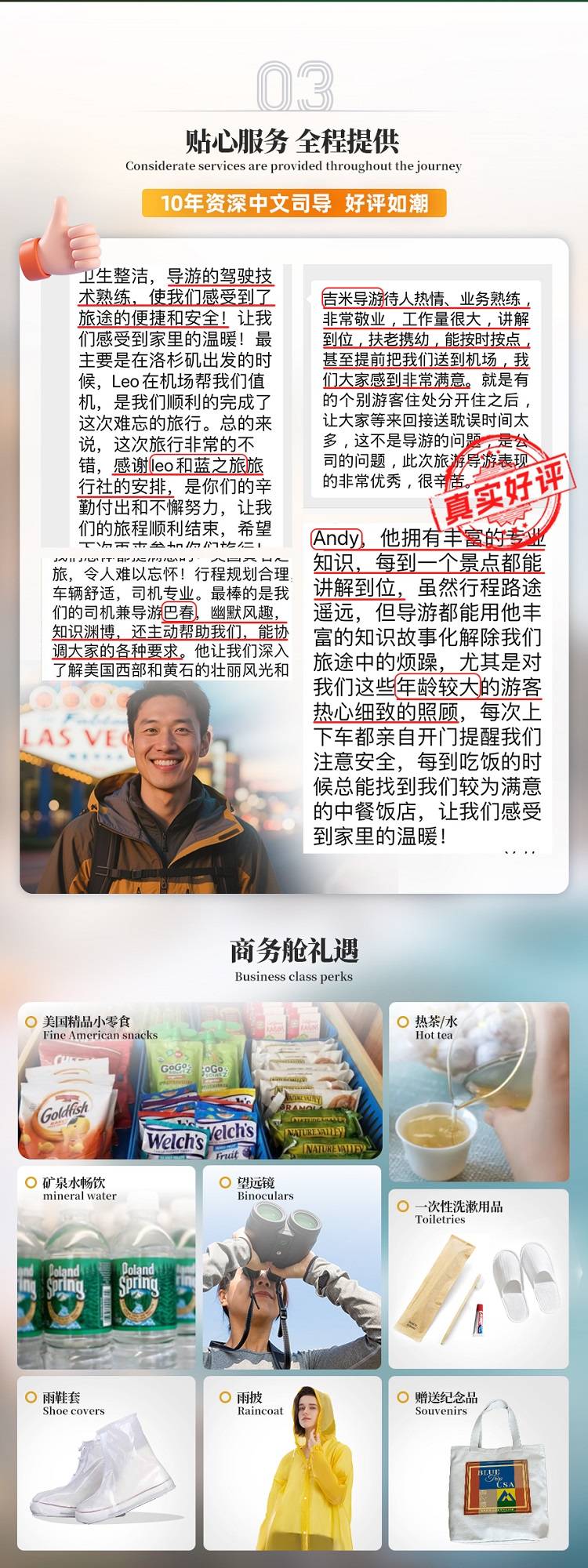 感谢您参加陆地商务舱VIP小团!此次行程中,我们沿着风光如画的太平洋沿岸线一路南下,途经梦幻迷人的17英里海岸线与充满艺术气息的小镇卡梅尔,尽览海天一色的壮丽风光。旅途中还深度探访了美西最有代表性的国家公园,包括雄伟壮观的大峡谷、红岩奇景的锡恩国家公园,让每位贵宾沉醉于大自然的鬼斧神工之中。
