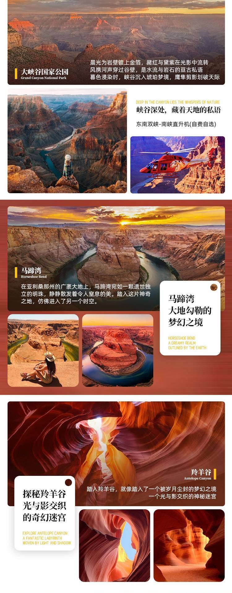 世界七大奇景之一的【科罗拉多大峡谷国家公园东南双峡】!BBC选出的全球50个人生必去旅游景点中,科罗拉多大峡谷高居榜首,它被联合国教科文组织列入世界自然遗产。不管你走过多少路,看过多少名山大川,你都会觉得大峡谷仿佛只能存在于另一个世界,或者另一个星球。【Desert View Point】(东峡)瞭望塔的景色提供了大峡谷东部的独特视角。从这里向东北望去,可以远远地瞥见科罗拉多河从相对狭窄的大理石峡谷向北过渡到更广阔、更广阔的大峡谷。【Mather Point】(南峡),这里同样也是欣赏大峡谷的非常适合的景点。可欣赏到广阔的峡谷景色。在晴朗的日子里,您可以看到东边 48 公里和西边96 公里。俯视峡谷,您可以看到科罗拉多河的一些小样本、峡谷底部的幻影牧场以及纵横交错的无数小径。也可以乘坐直升机用上帝的视角观看大峡谷(南峡直升机费用自理,需提前预定),从南缘出发的大峡谷直升机,会带您穿越美丽的凯巴布国家森林 (Kaibab National Forest),这里是世界上最大的黄松林的所在地。到达边缘后,边缘逐渐消失,壮丽的大峡谷尽收眼底。直升机观光无疑是观看峡谷的最适合方式。