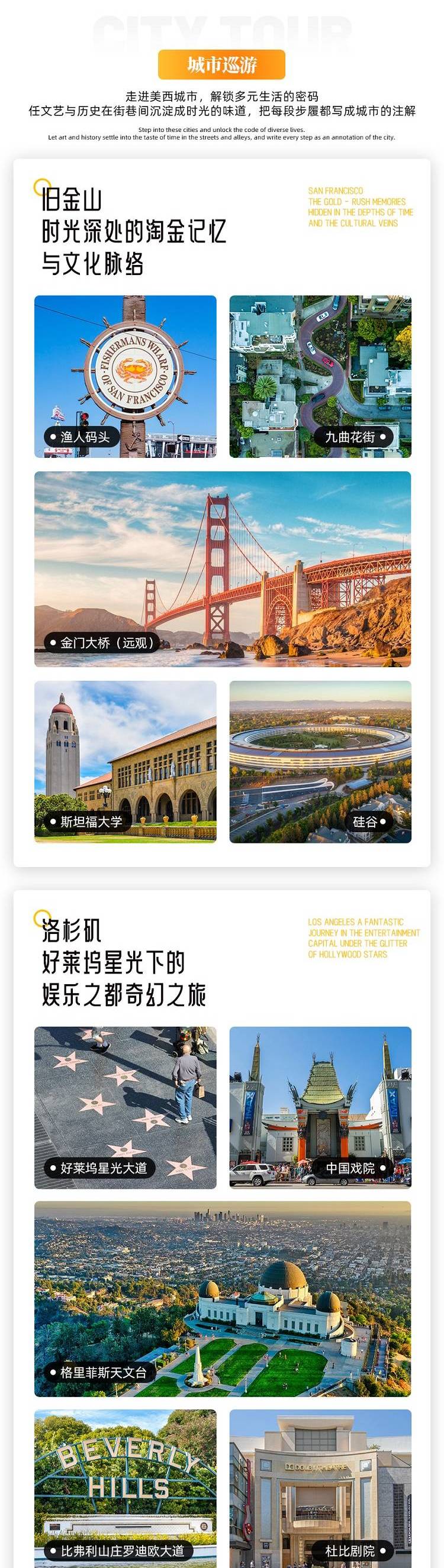 *斯坦福大学(约40分钟)→硅谷科技园(约40分钟)→渔人码头(约60分钟)→艺术宫(约15分钟)→金门大桥远观(约30分钟)→九曲花街(约25分钟)→车游唐人街。