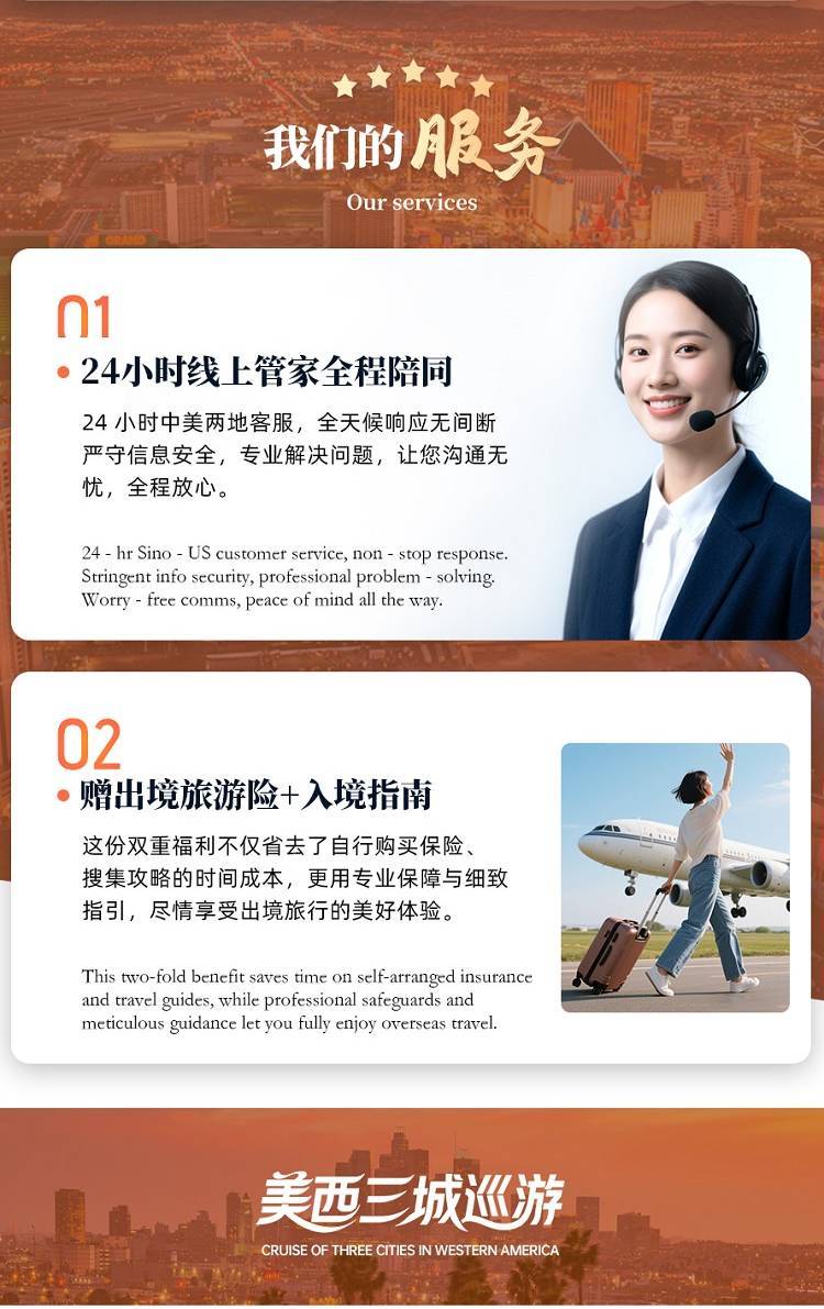 | 第六天 拉斯-洛杉矶 | 早餐外送早餐 午餐奥特莱斯自理 晚餐中式桌餐 | $45 | $45 |