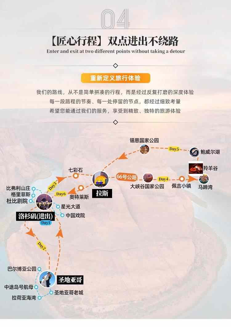 | 第4天 | 拉斯维加斯-66公路-东南双峡谷-马蹄湾 | 拉斯维加斯大峡谷南缘大峡谷西缘马蹄湾佩吉 | |