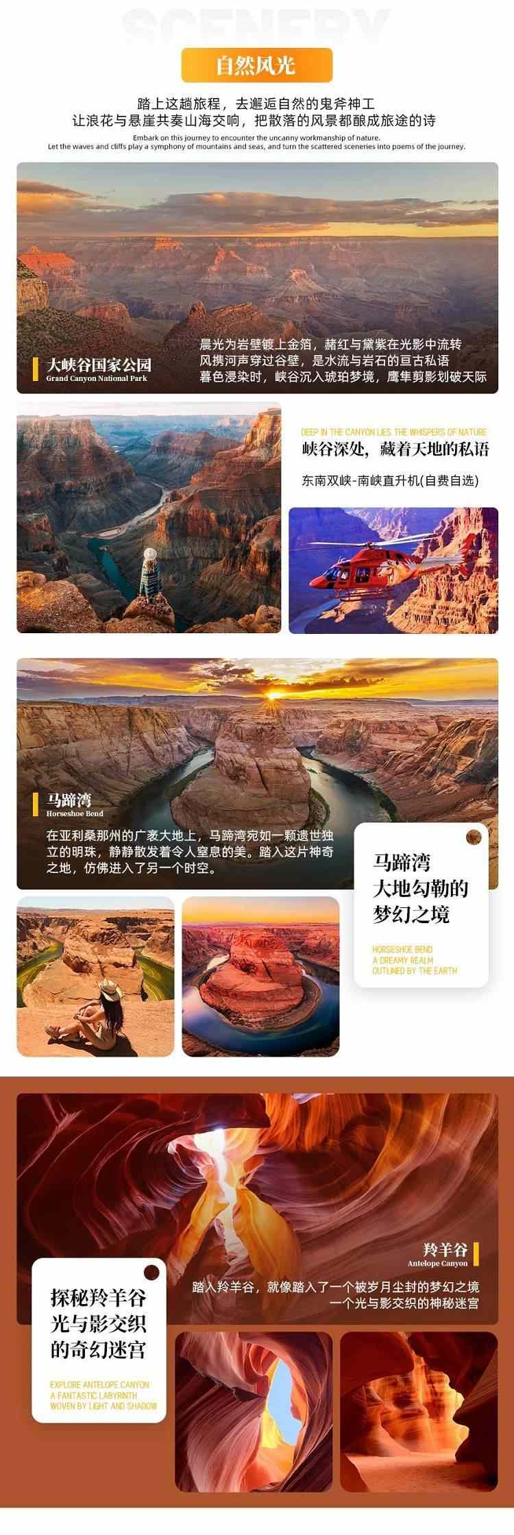 世界七大奇景之一的【科罗拉多大峡谷国家公园东南双峡】!BBC选出的全球50个人生必去旅游景点中,科罗拉多大峡谷高居榜首,它被联合国教科文组织列入世界自然遗产。不管你走过多少路,看过多少名山大川,你都会觉得大峡谷仿佛只能存在于另一个世界,或者另一个星球。【Desert View Point】(东峡)瞭望塔的景色提供了大峡谷东部的独特视角。从这里向东北望去,可以远远地瞥见科罗拉多河从相对狭窄的大理石峡谷向北过渡到更广阔、更广阔的大峡谷。【Mather Point】(南峡),这里同样也是欣赏大峡谷的非常适合的景点。可欣赏到广阔的峡谷景色。在晴朗的日子里,您可以看到东边 48 公里和西边96 公里。俯视峡谷,您可以看到科罗拉多河的一些小样本、峡谷底部的幻影牧场以及纵横交错的无数小径。也可以乘坐直升机用上帝的视角观看大峡谷(南峡直升机费用自理,需提前预定),从南缘出发的大峡谷直升机,会带您穿越美丽的凯巴布国家森林 (Kaibab National Forest),这里是世界上最大的黄松林的所在地。到达边缘后,边缘逐渐消失,壮丽的大峡谷尽收眼底。直升机观光无疑是观看峡谷的最适合方式。