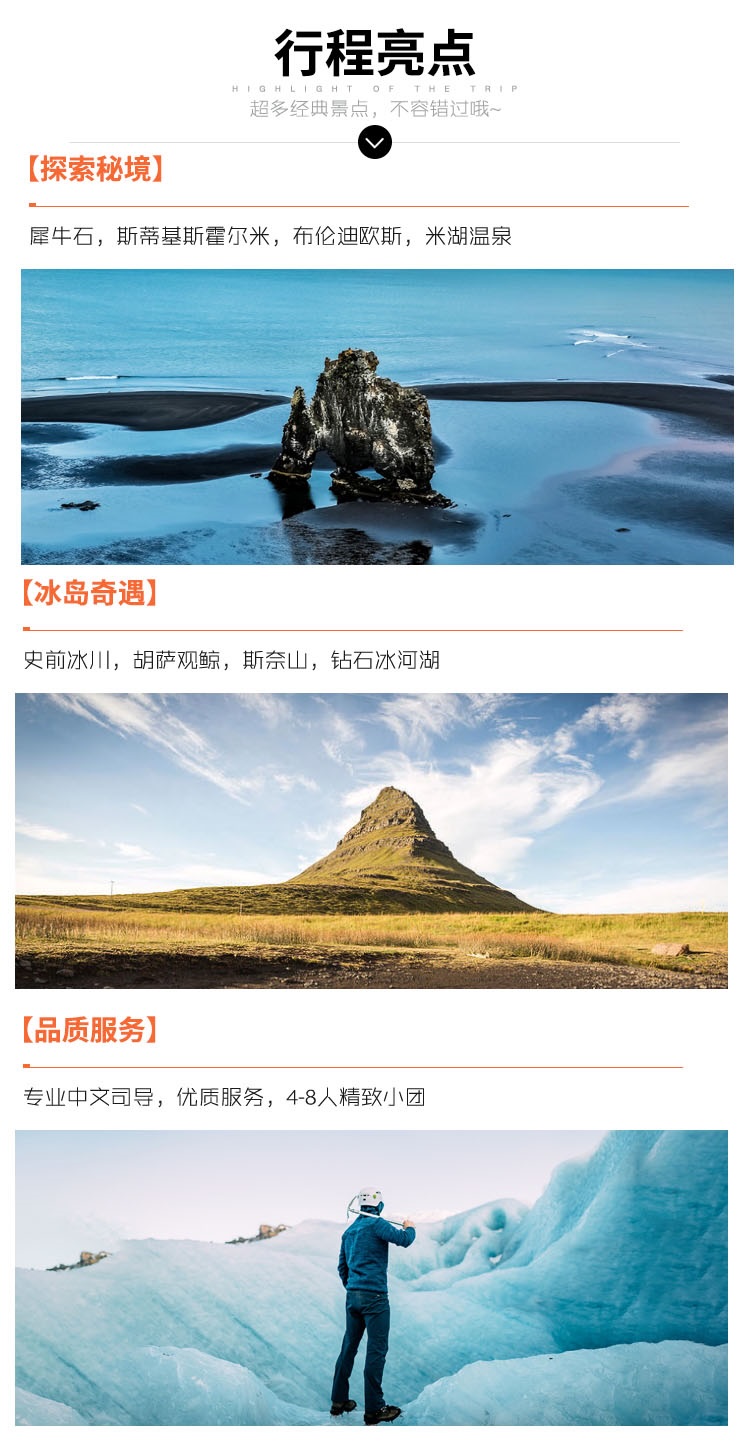 | 第1天 | 雷克雅未克 → 塞里雅兰瀑布 → 斯科加瀑布 → 黑沙滩 → 索尔黑马冰川徒步 → 维克镇/教堂镇 | 雷克雅未克斯科加瀑布黑沙滩 | |