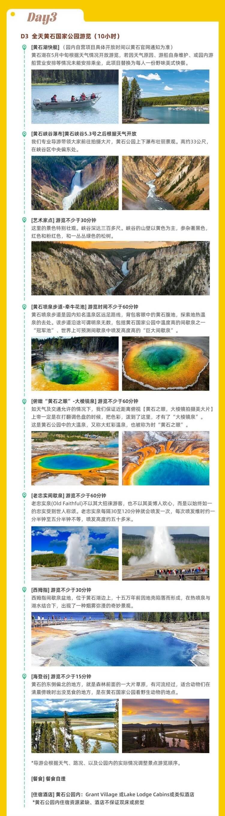| 第3天 | 黄石国家公园全天游览 | 黄石国家公园艺术家观测点黄石瀑布黄石湖大棱镜温泉老忠实间歇泉西拇指 |