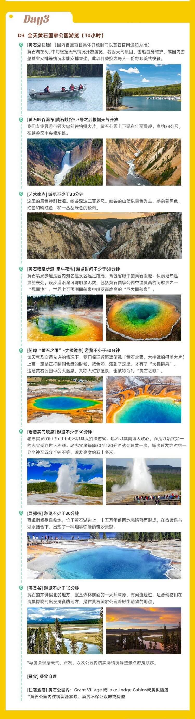 | 第3天 | 黄石国家公园全天游览 | 黄石国家公园艺术家观测点黄石瀑布黄石湖大棱镜温泉老忠实间歇泉西拇指 |